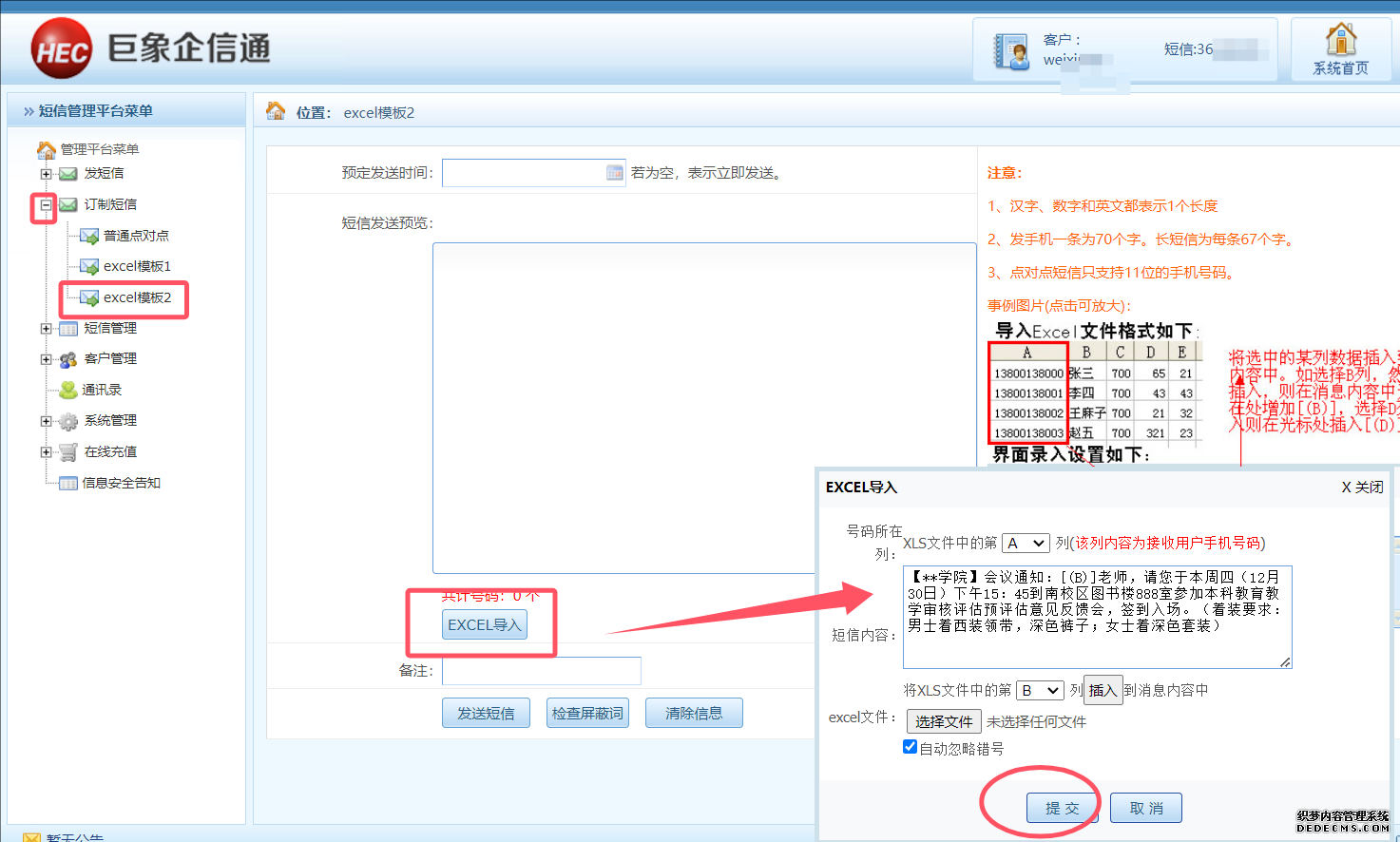 2、個性化變量會議通知短信一對一發(fā)送操作,即一個批次群發(fā)的手機號碼收到的內(nèi)容不完全一樣,如內(nèi)容里加入稱呼、工資條、物業(yè)費、賽事編號、座位號、學號等。 首先點擊左側(cè)導航條的訂制短信,如下圖所示。有三種個性化變量短信提交方法,可根據(jù)您自身資料格式選擇其中一種。